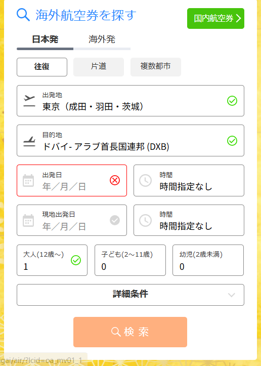 上記のサイトから入って、上部のカテゴリーから「海外航空券」を選ぶと、下のような検索画面になります。