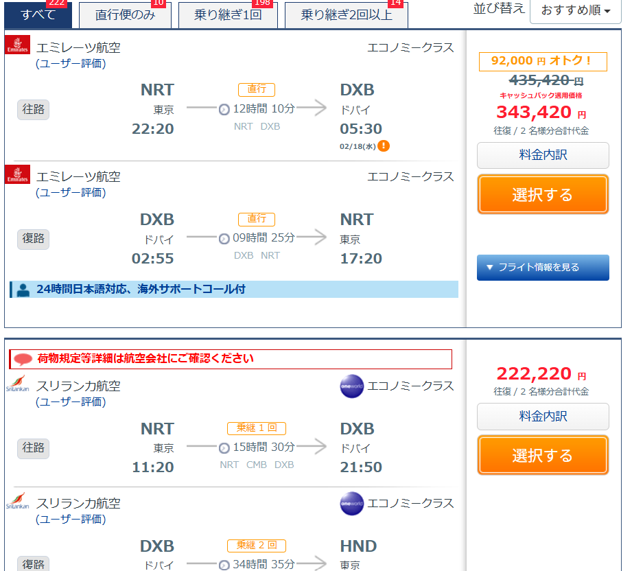 エミレーツ航空の他にも、スリランカ航空やエア・インディア、大韓航空などの航空会社も選べます。